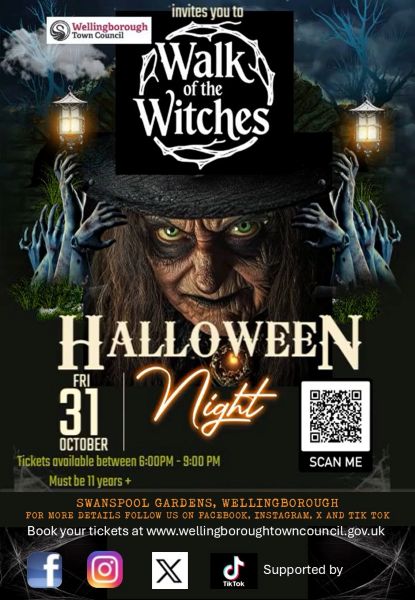 Wellingborough Town Council invite you to gather your bravest friends, to step into the shadows to experience the spine-chilling Walk of the Witches in the hauntingly beautiful Swanspool Gardens.