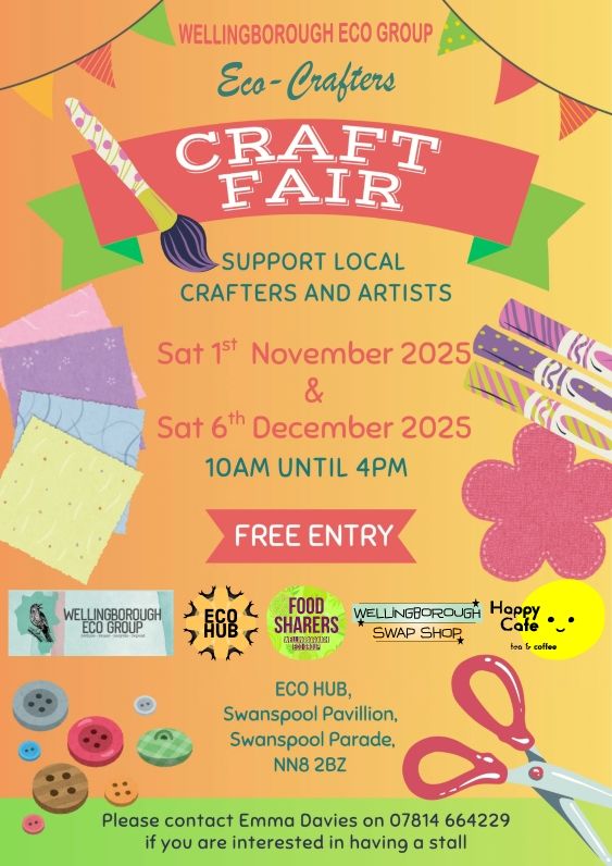 The Craft Fair has several stalls from local artists already booked in, if you would like a stall, please fill in the form below, email info@wellingboroughecogroup.org.uk or call/message/WhatsApp 07814 664229. Small tables are £5 and large tables £10, stalls need to be paid for before the craft Fair, secure your space today!